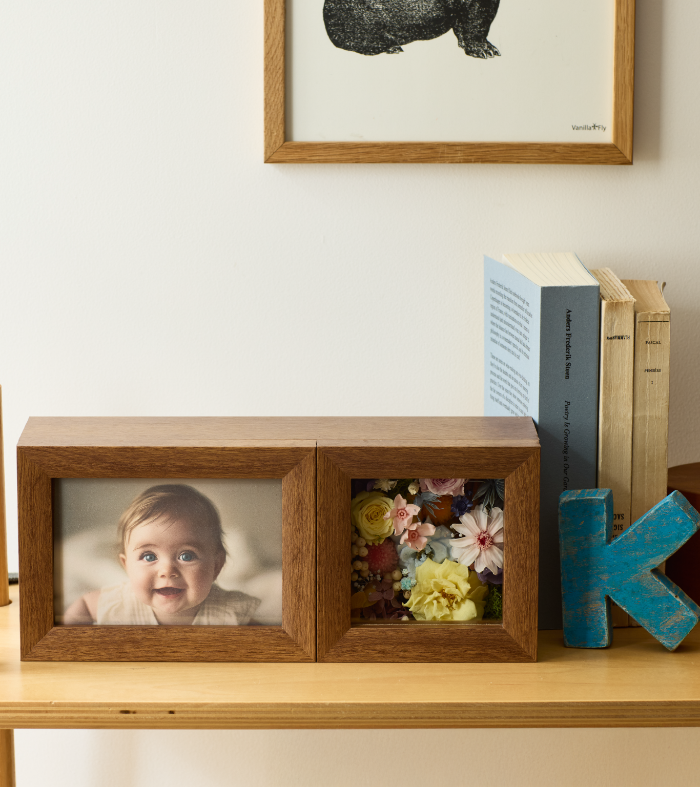 大切な記憶を、写真とともに思い出としてかたちに残すフォトボックス。思い出の品を収納できる2つのスペースがあり、飾りながら記憶をそっと包み込みます。出産祝いや家族の記念日を彩るギフトとしてはもちろん、大切な人やペットとの思い出を静かに飾る場面にも。暮らしに寄り添い、心をやさしくつなぐインテリアです。